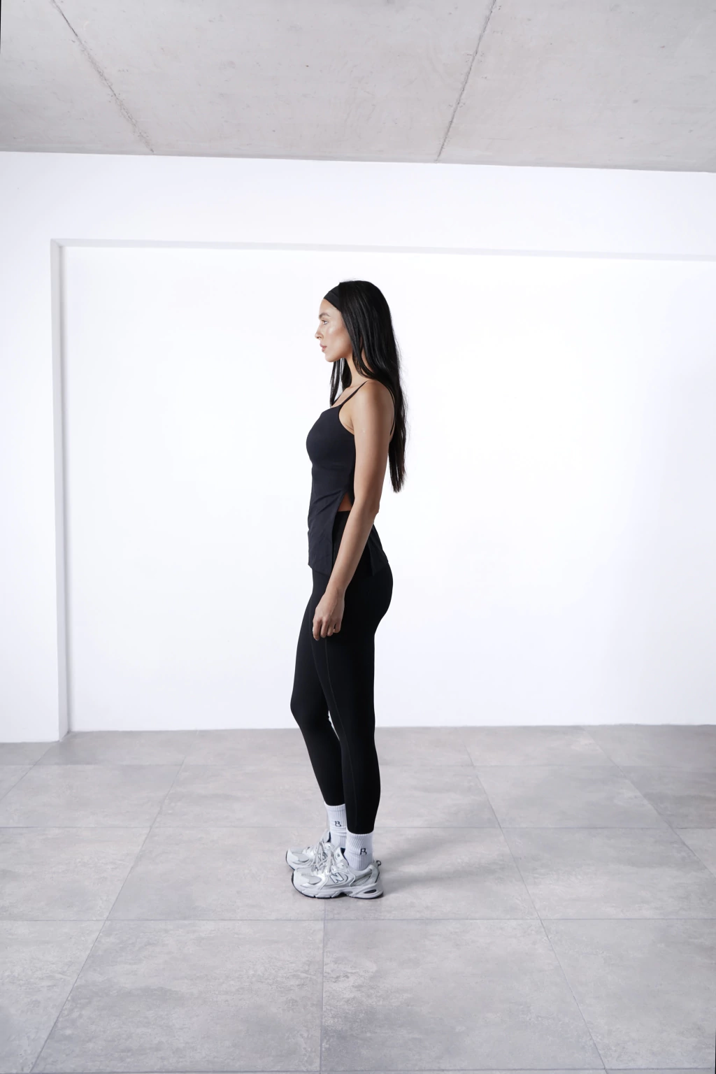 Su diseño incorpora un elástico interno debajo del busto y tazas fijas, que brindan un soporte seguro y eliminan la necesidad de usar corpiño deportivo. Además, su corte ajustado realza la figura y el frunce lateral regulable con tira de ajuste permite personalizar el largo de la musculosa, logrando un look más deportivo o urbano según tu preferencia.